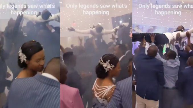 In the clip, the groom is seen being lifted horizontally by his friends while dancing energetically to a popular song commonly associated online with coffin-carrying pallbearers.